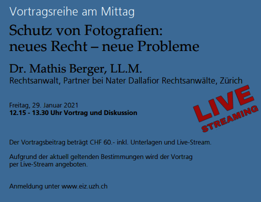 Das Europa Institut in Zürich organisiert immer wieder Anlässe auf rechtlichem Gebiet. Am 29. Januar 2021 wird von 12:15 bis 13.15 Uhr eine Online-Rechtsveranstaltung angeboten, die für SBF Mitglieder von Interesse ist. Anwalt Dr. Mathis Berger wird einen Vortrag über Schutz von Fotografien: neues Recht – neue Probleme halten.